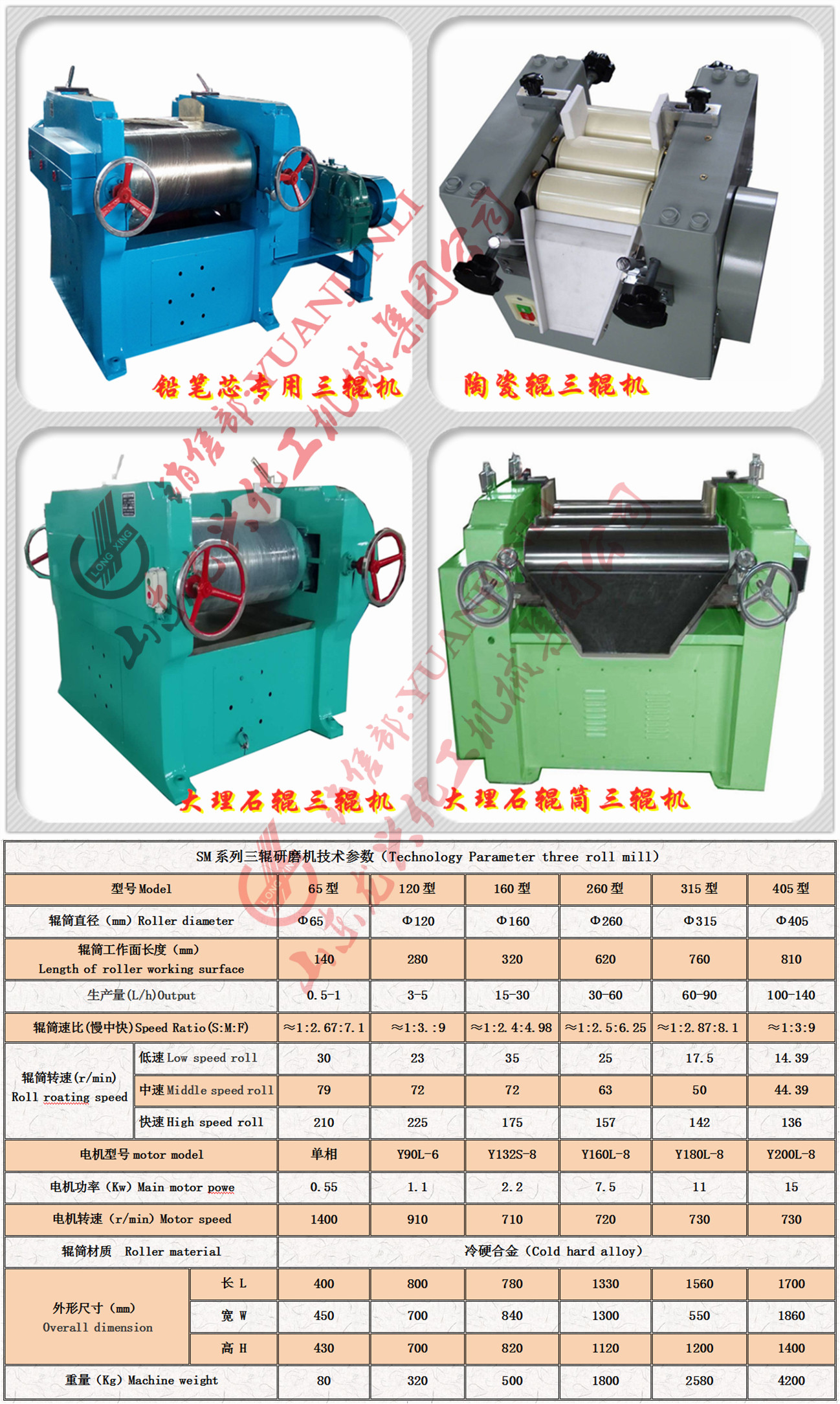 1、三輥研磨機(jī)輥筒材質(zhì)大理石加工而成,特別適合與美術(shù)染料和食品物料的加工