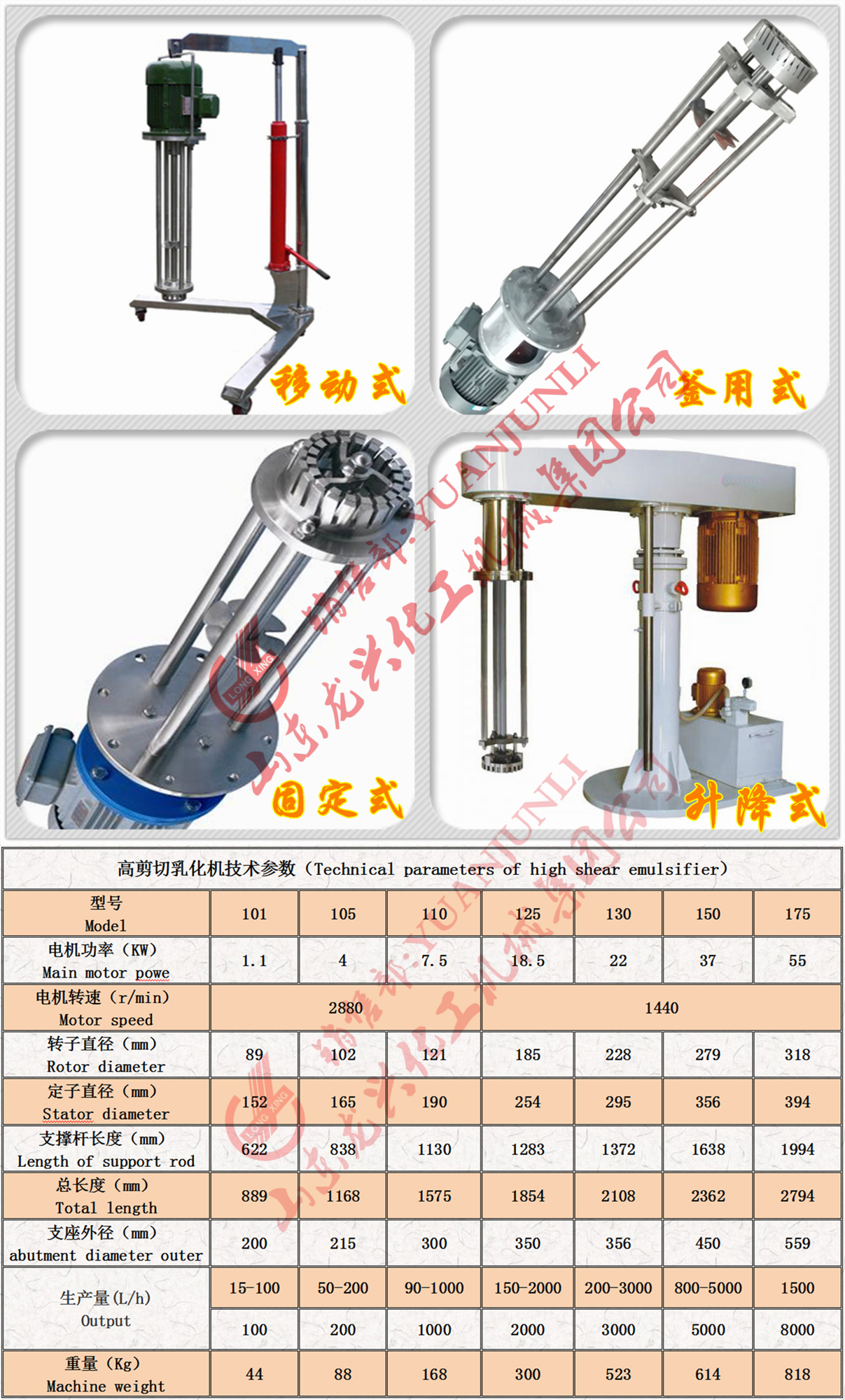 一般情況下110以下規(guī)格配有移動(dòng)式吊架,同時(shí)乳化機(jī)也可設(shè)計(jì)制作成升降式的,升降式一般可分為機(jī)械升降或者液壓升降兩種。