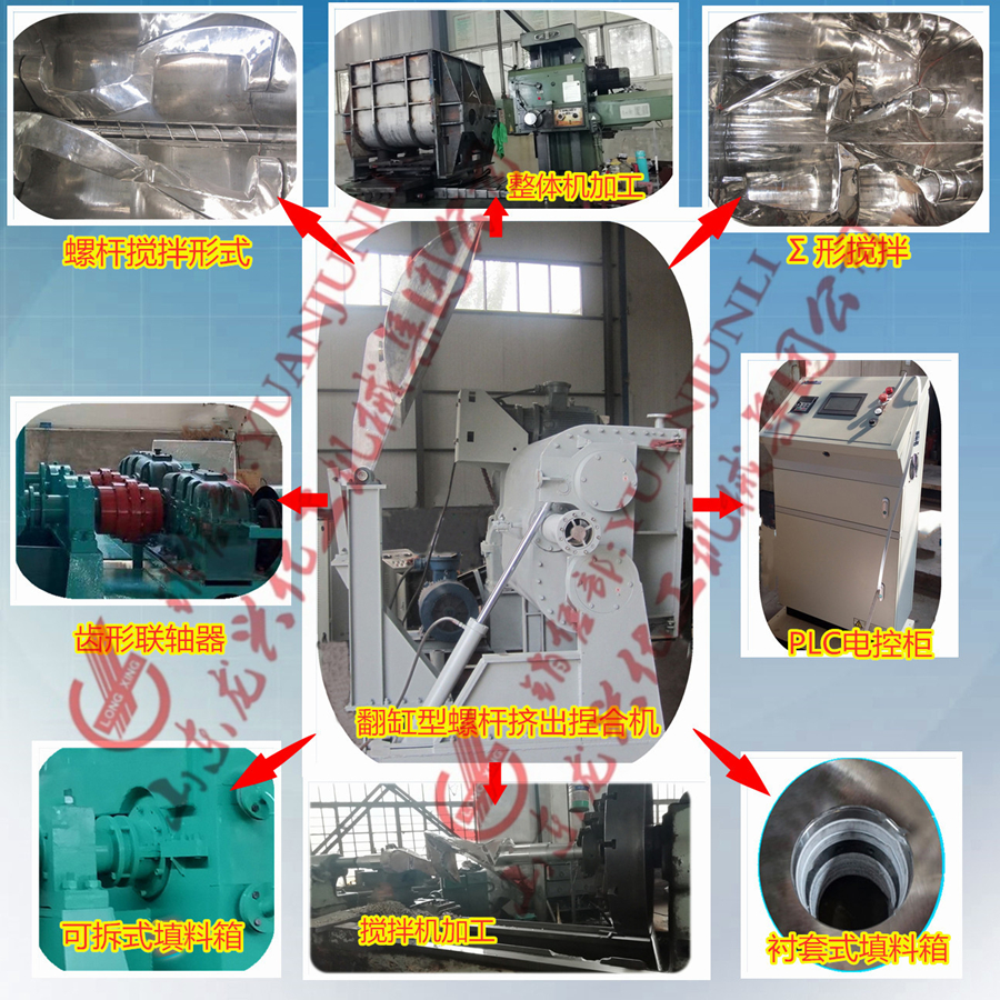螺桿擠出型捏合機主要是由混捏部分、螺桿擠出部分、機座部分、液壓系統、傳動系統和電控系統等五大部分組成。液壓系統由一臺液壓站來操縱大油缸,來完成啟閉功能,液壓系統由一臺液壓站來操縱油缸,來完成翻缸、啟蓋等功能;