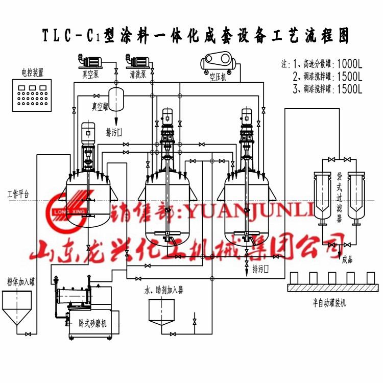 涂料生產成套設備能獨立完成乳化、分散、研磨、細化、冷卻、過濾、真空自動吸料以及半自動灌裝等全過程。